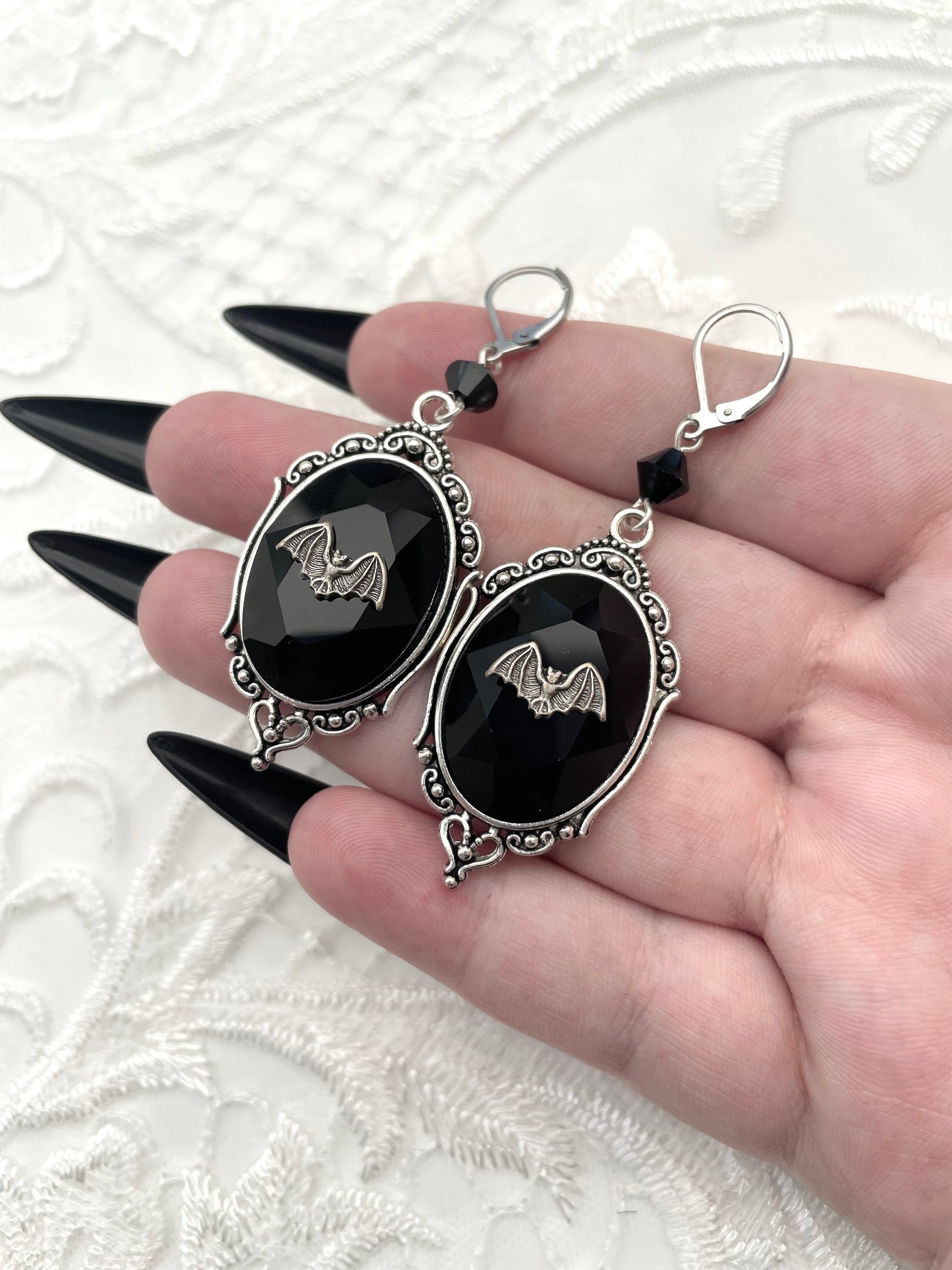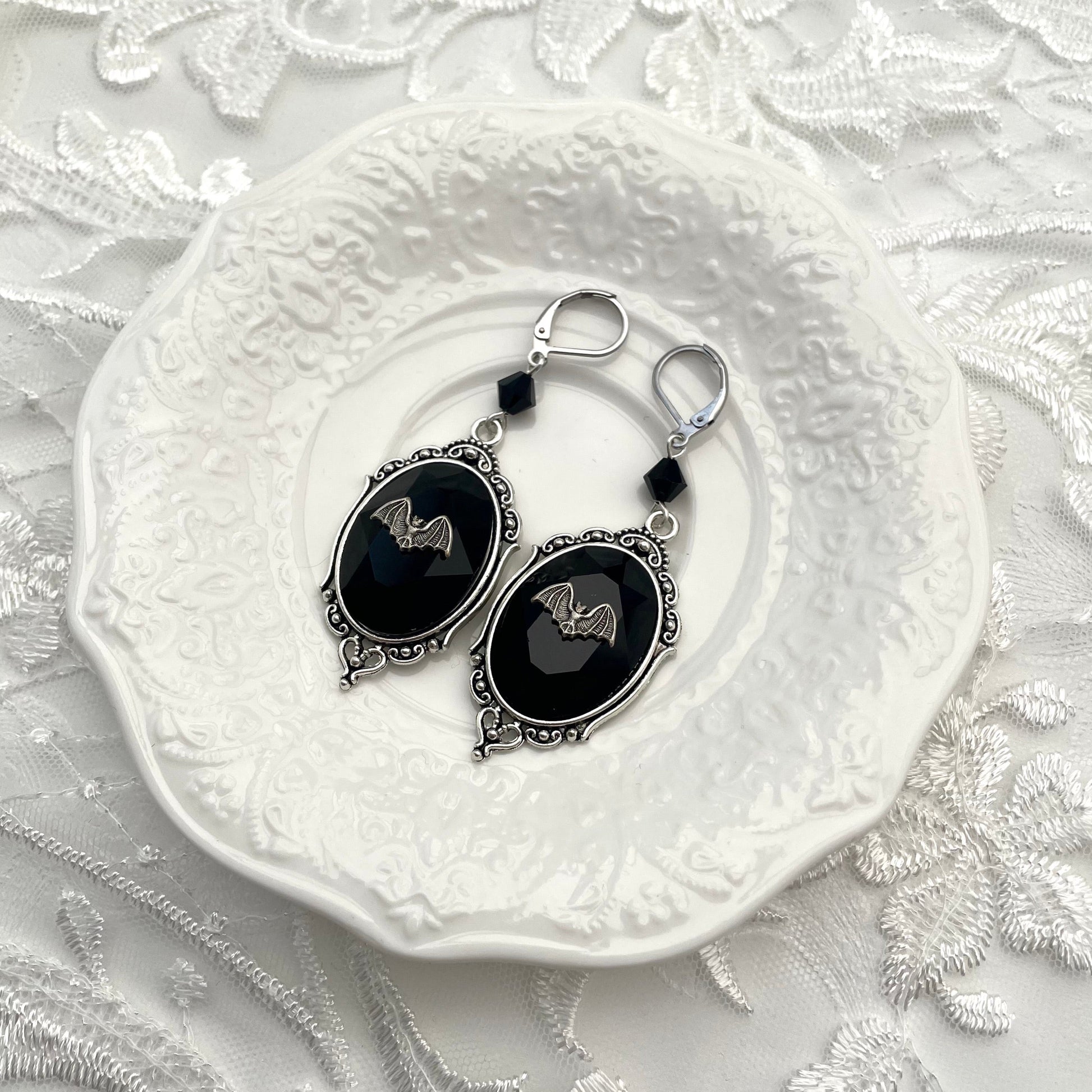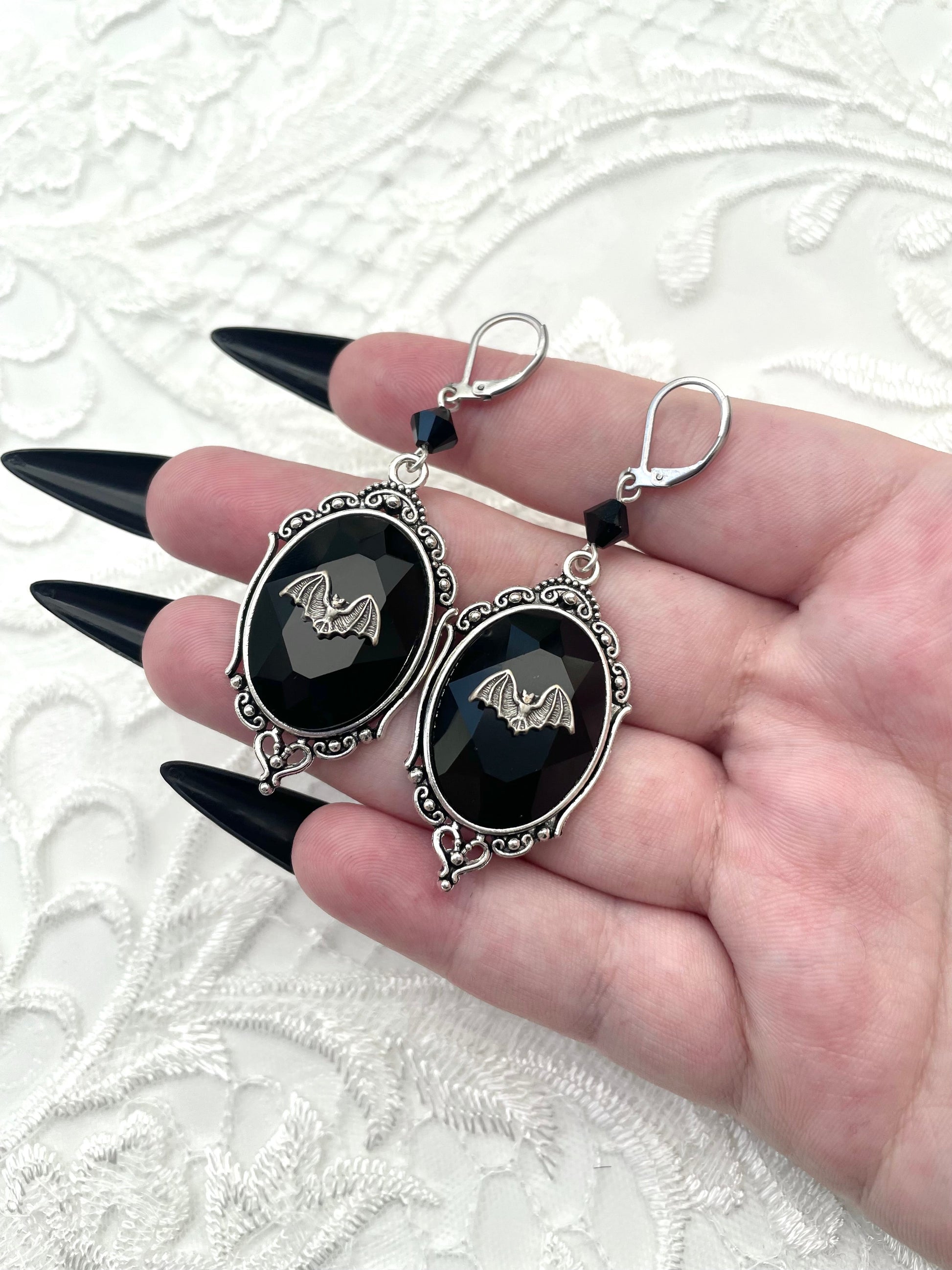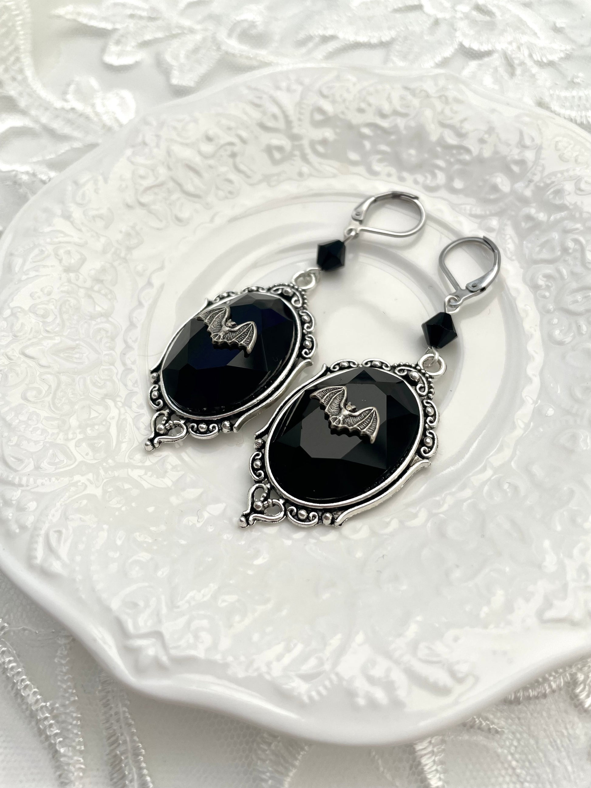 These earrings feature the most adorable silver bats perching on beautiful faceted glass jewels that sit in a silver tone setting. They are also accompanied by high quality, finely cut glass crystal beads.