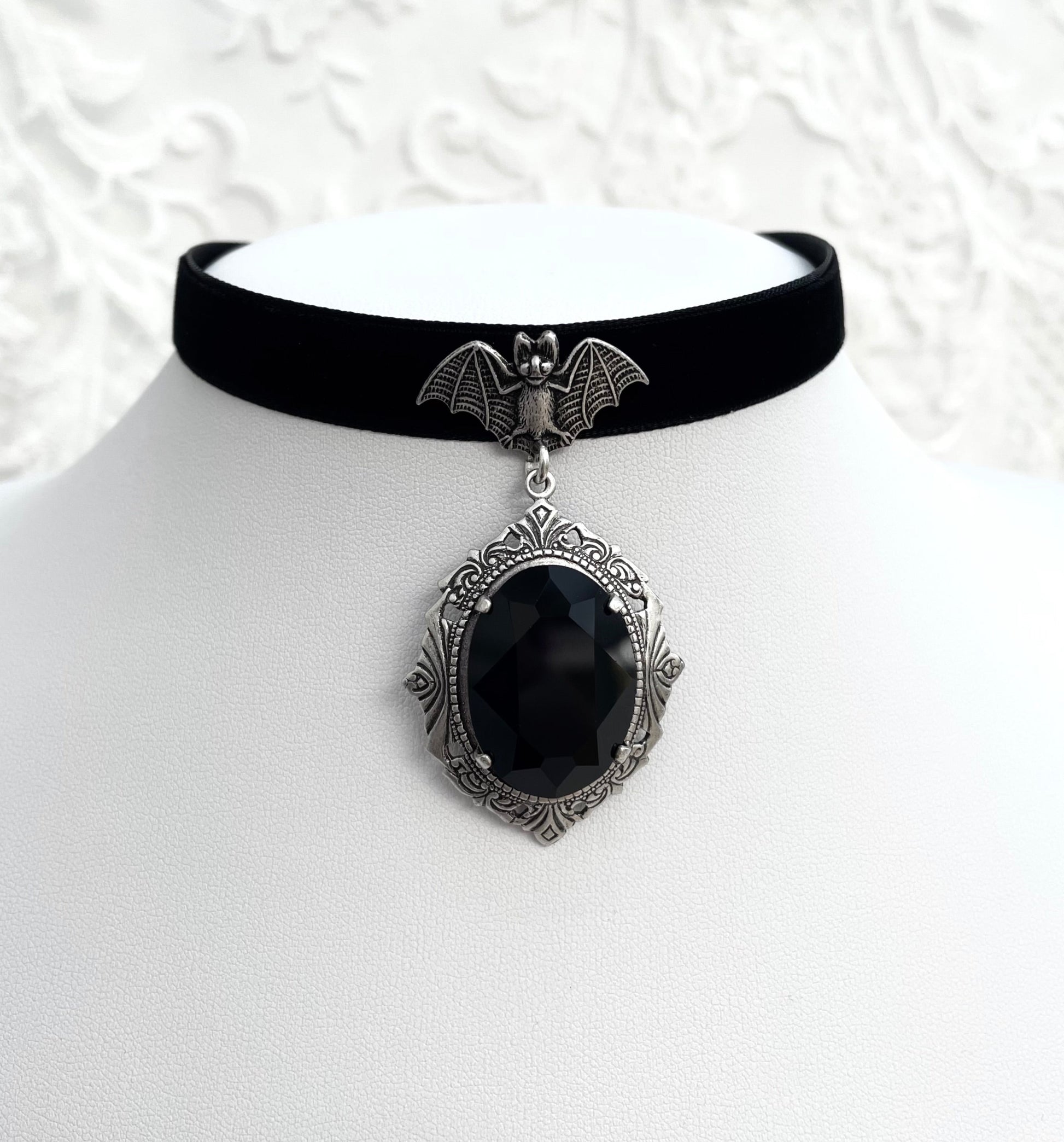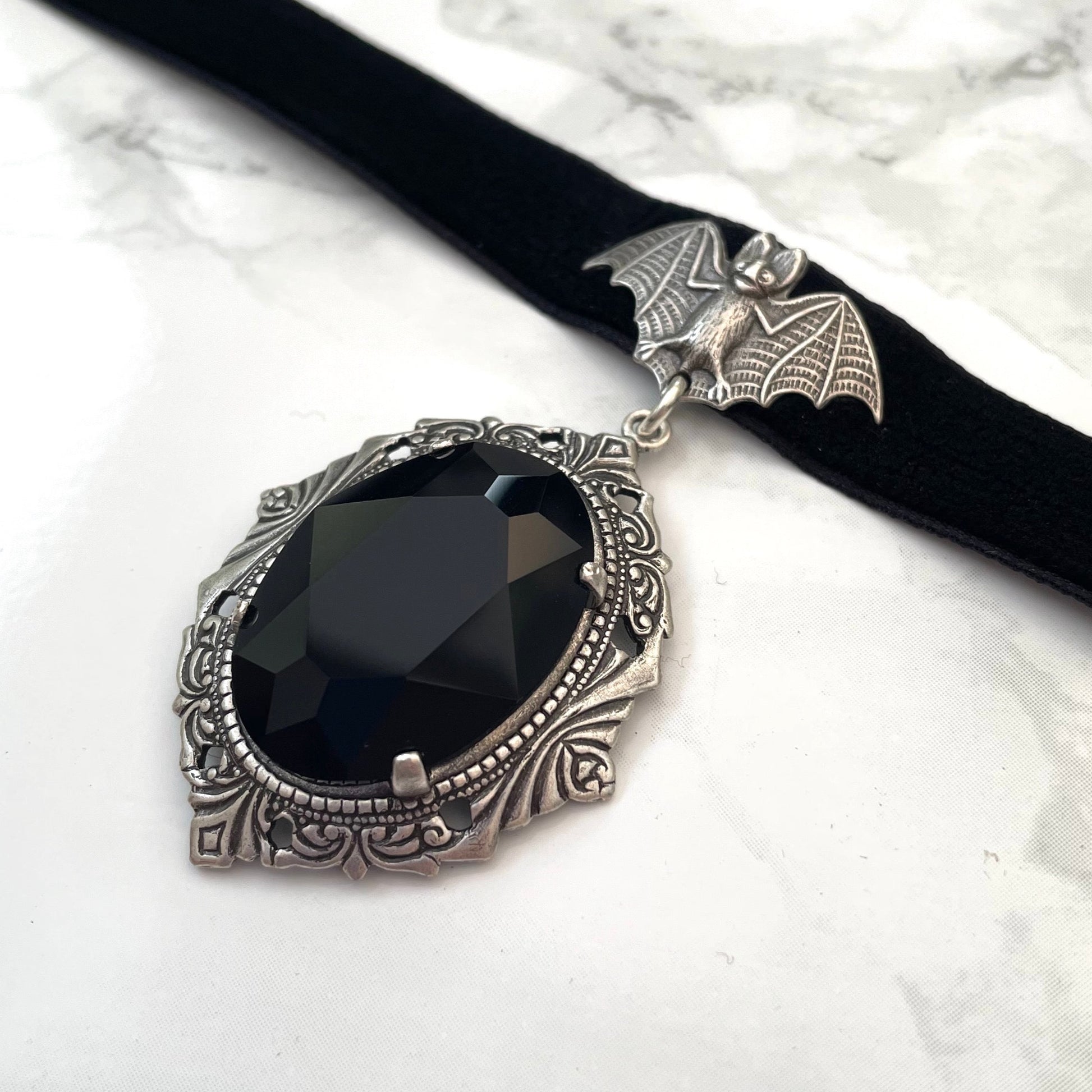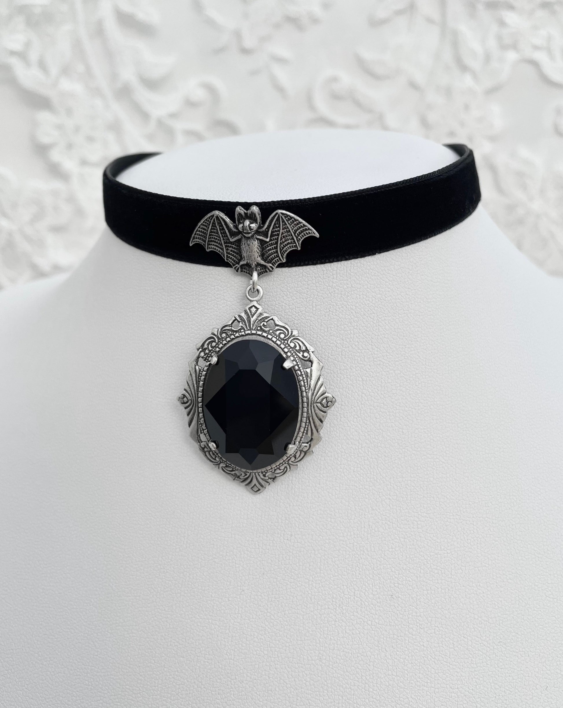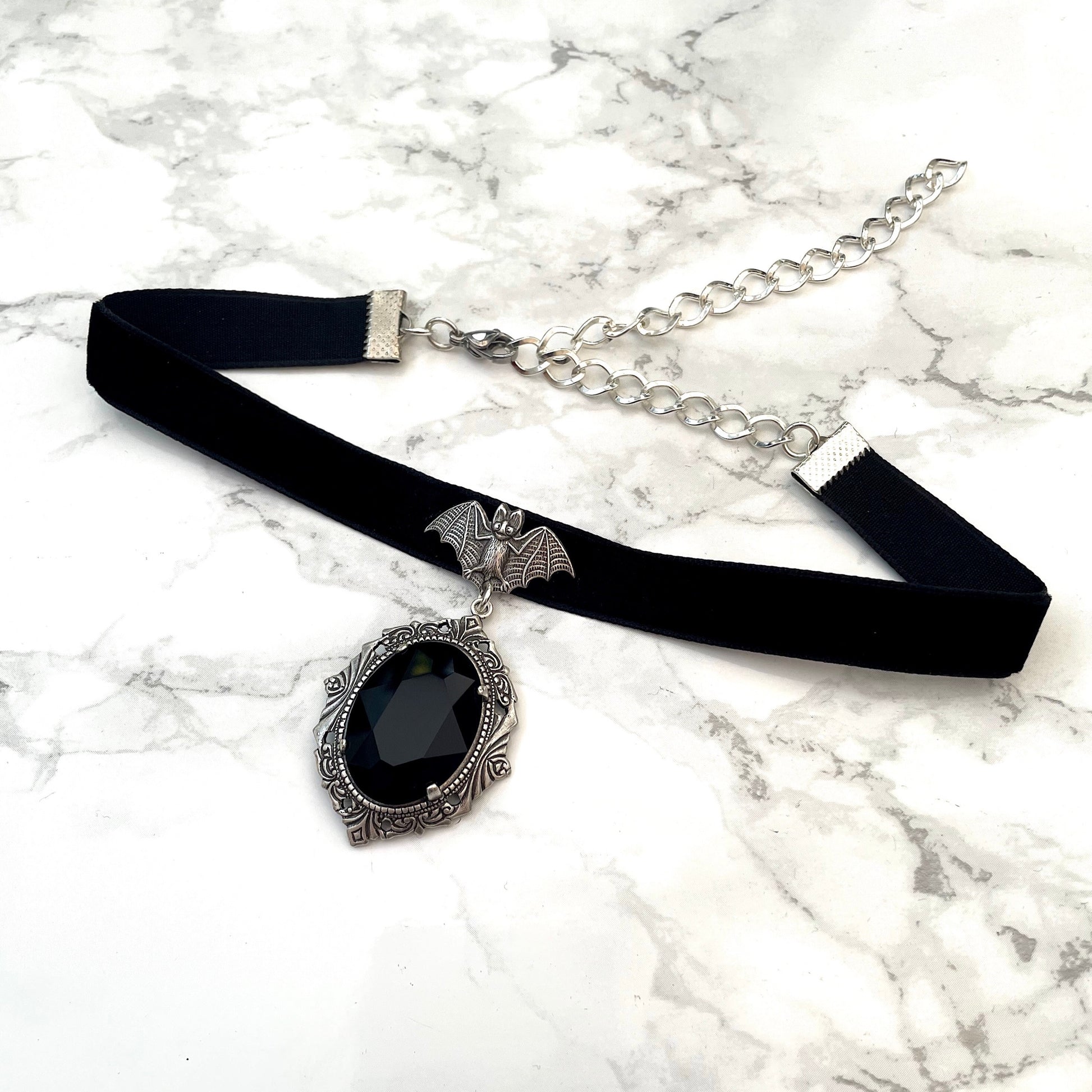 This spooky choker features an adorable detailed bat that carries a gorgeous antique style silver tone frame that lovingly embraces a beautifully cut glass jewel. A lovely piece for a bat lover!