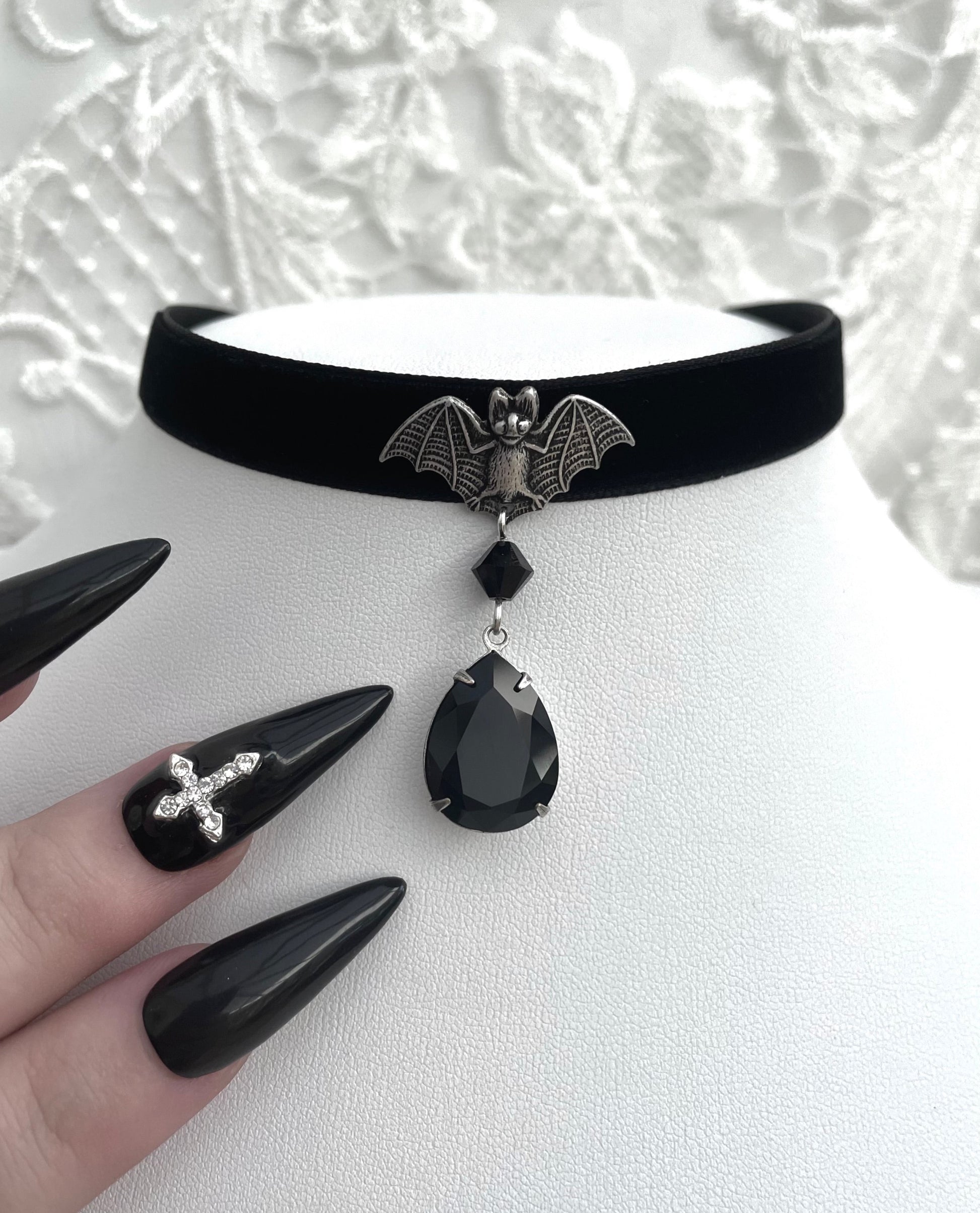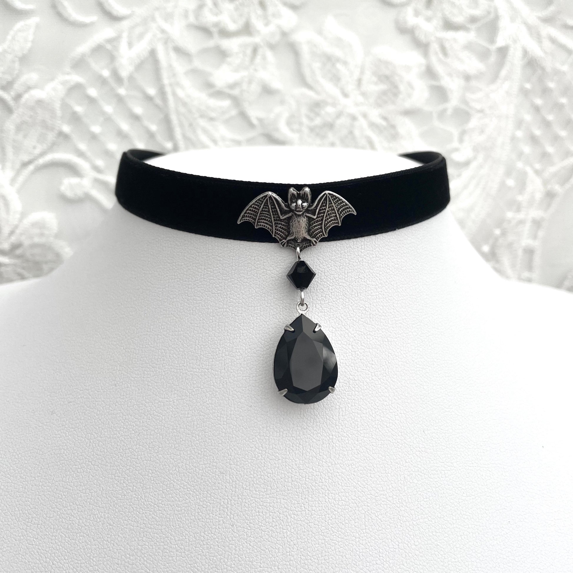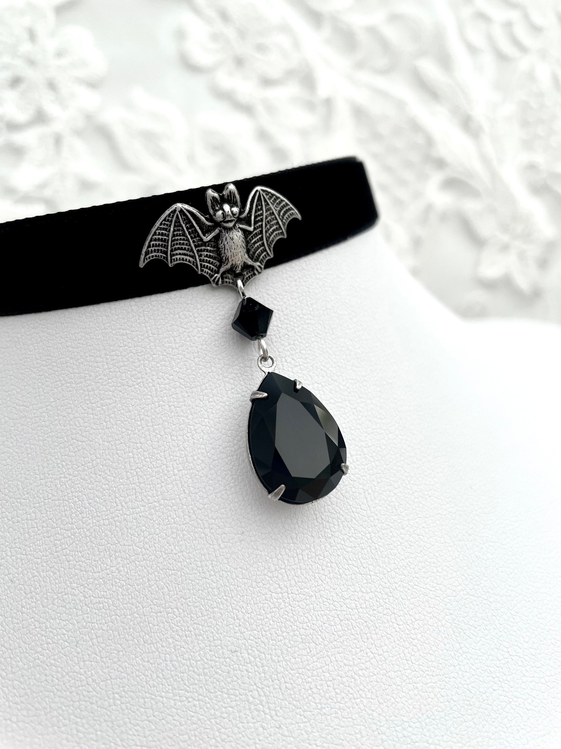 This spooky choker features an adorable detailed bat that carries a beautiful, high quality glass tear drop. A lovely piece for a bat lover!
