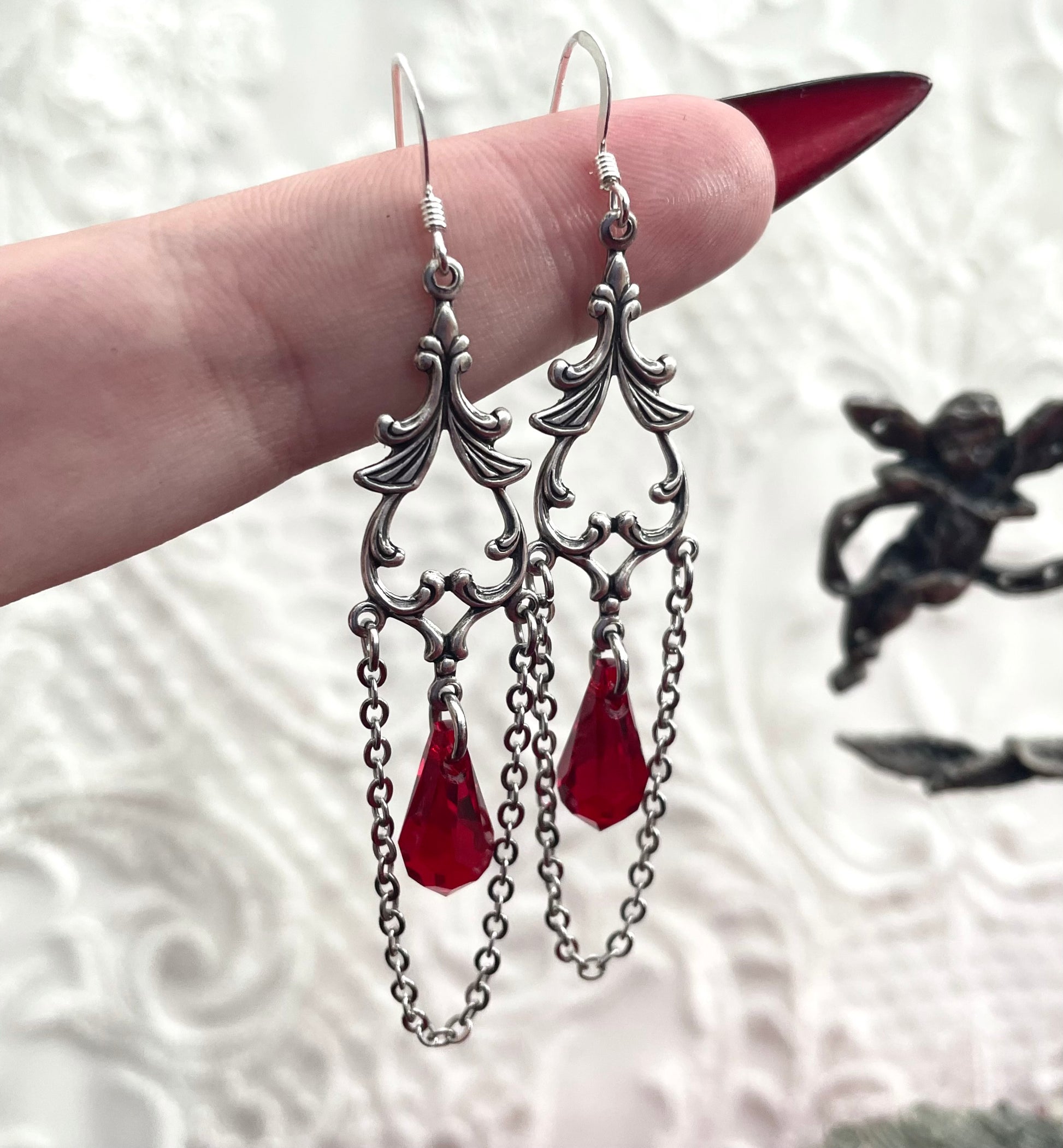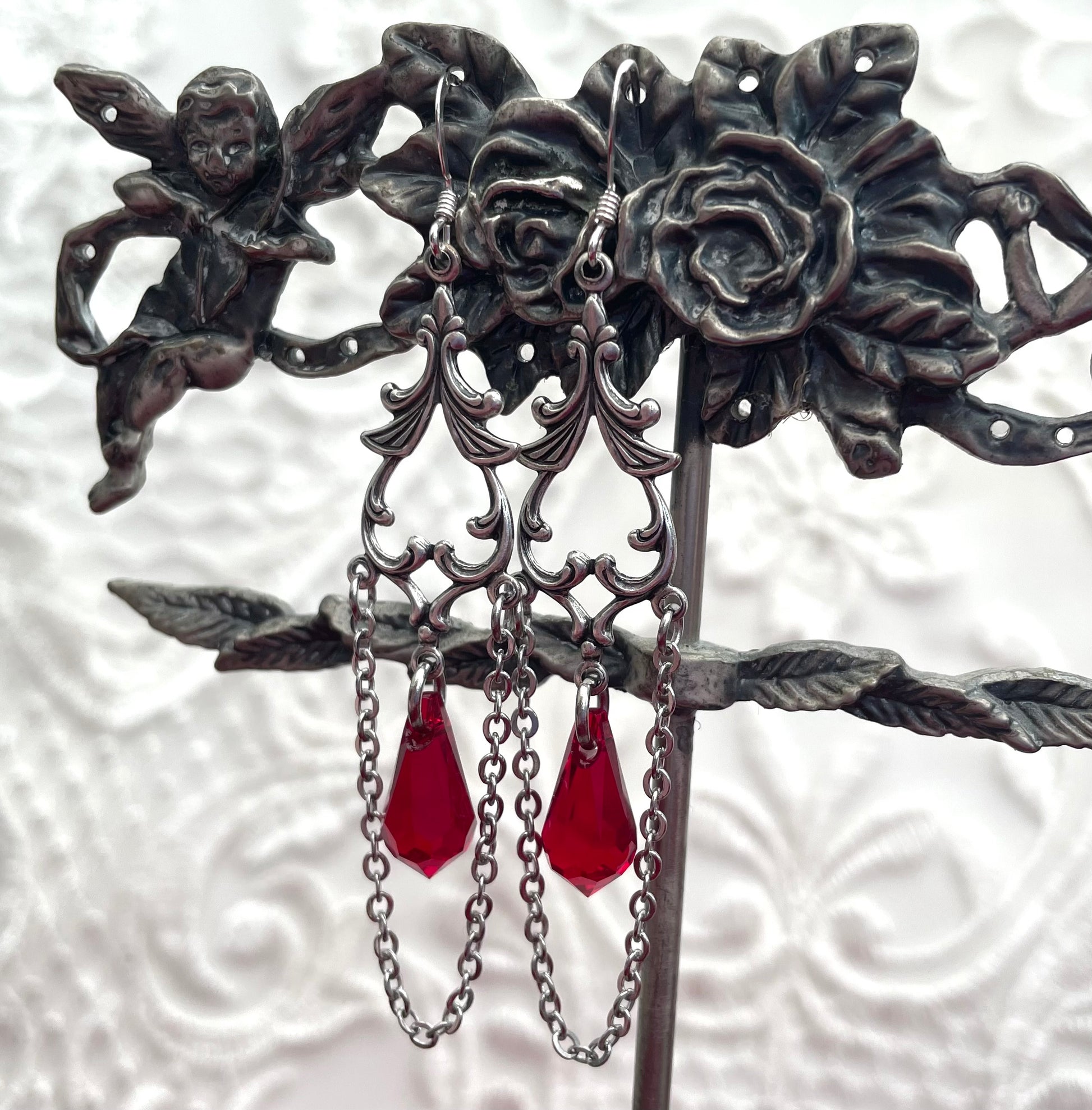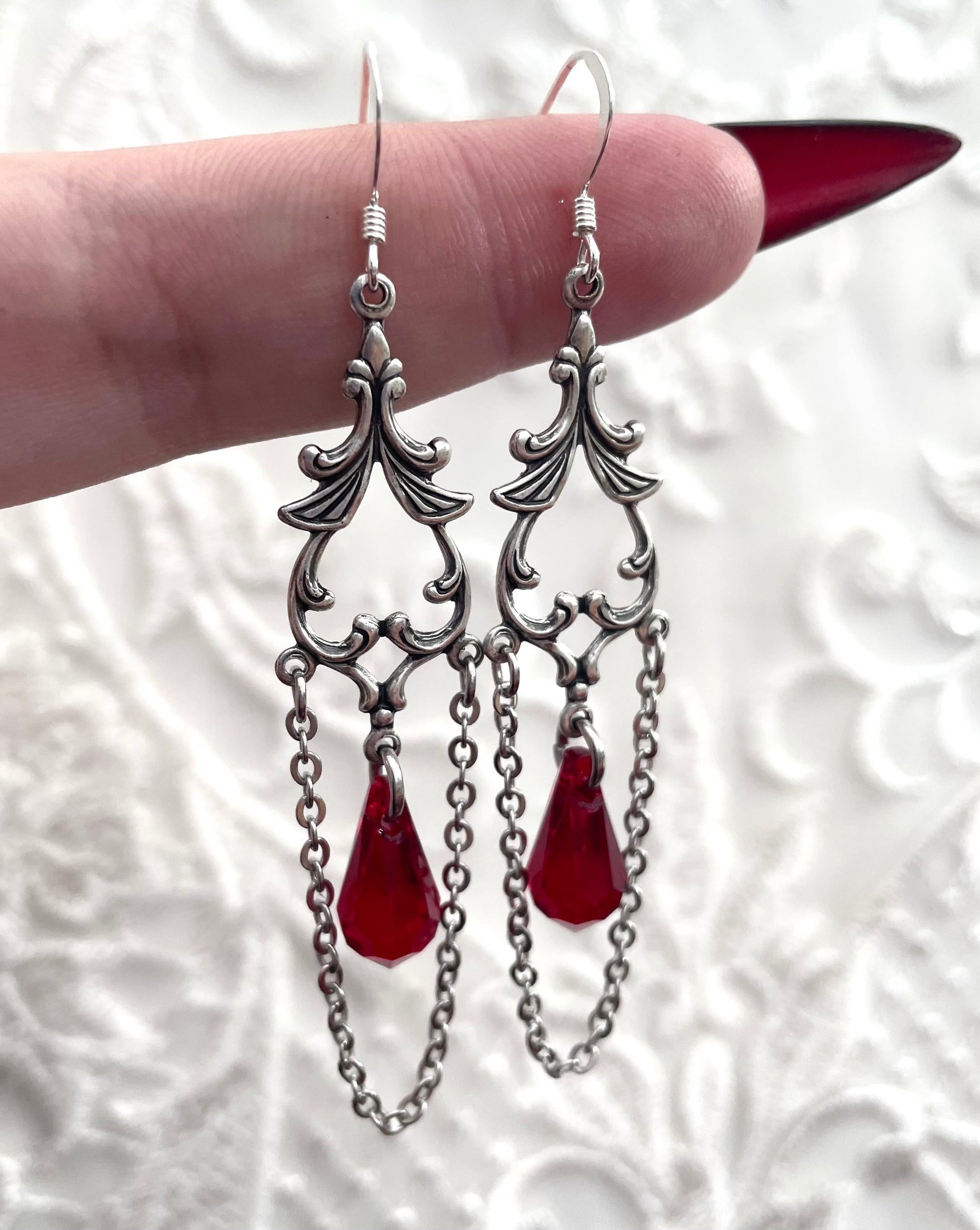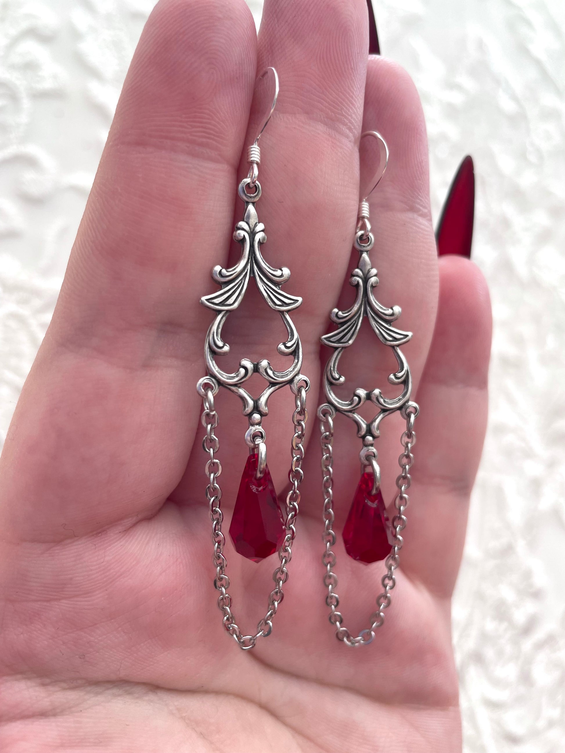 These victorian inspired earrings feature beautifully faceted glass drops and a dainty chain to complete the overall shape.