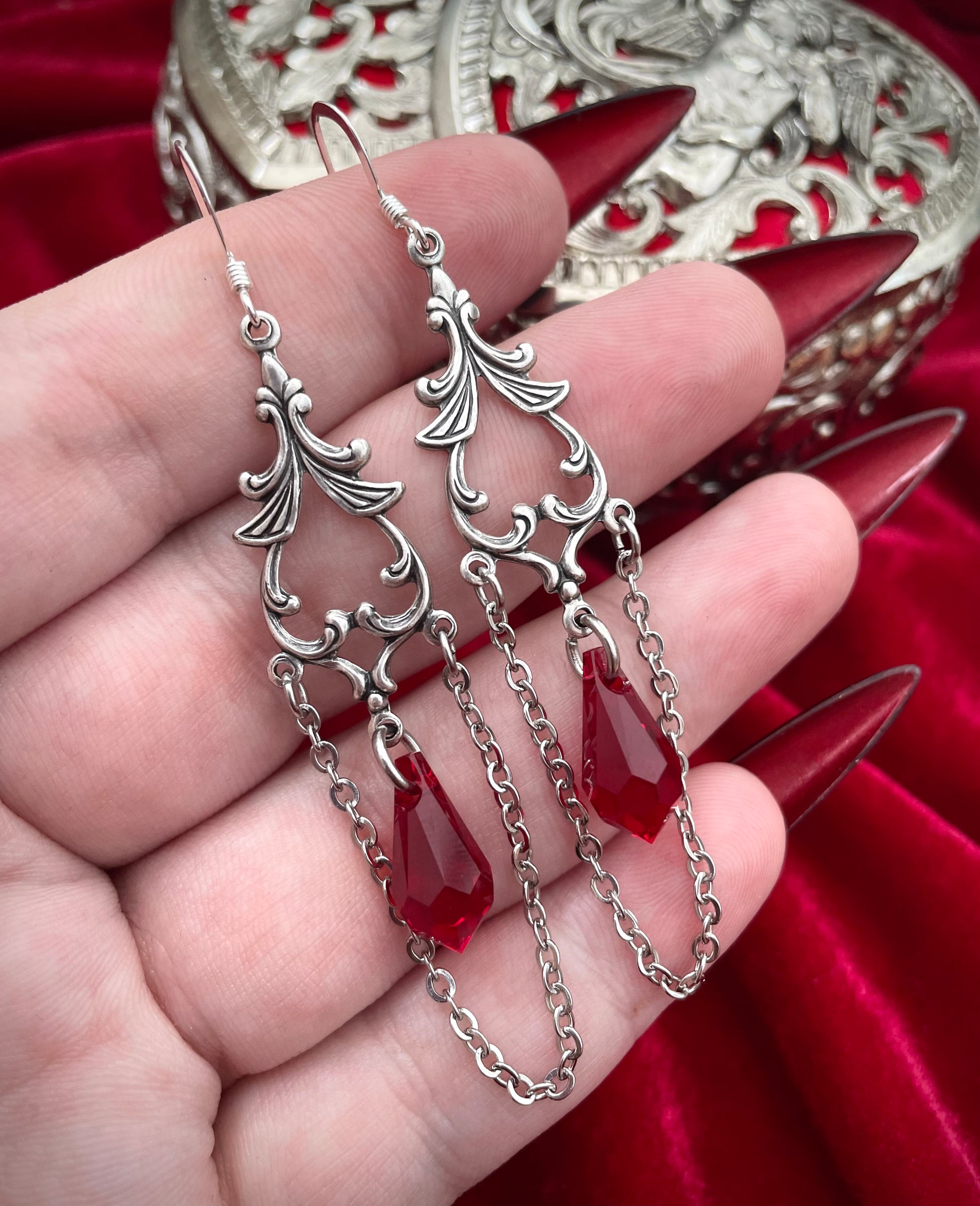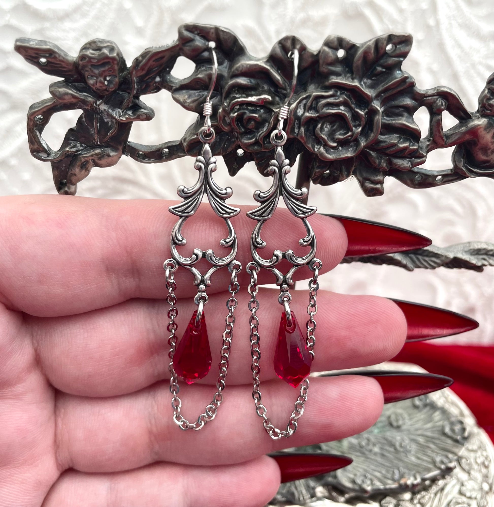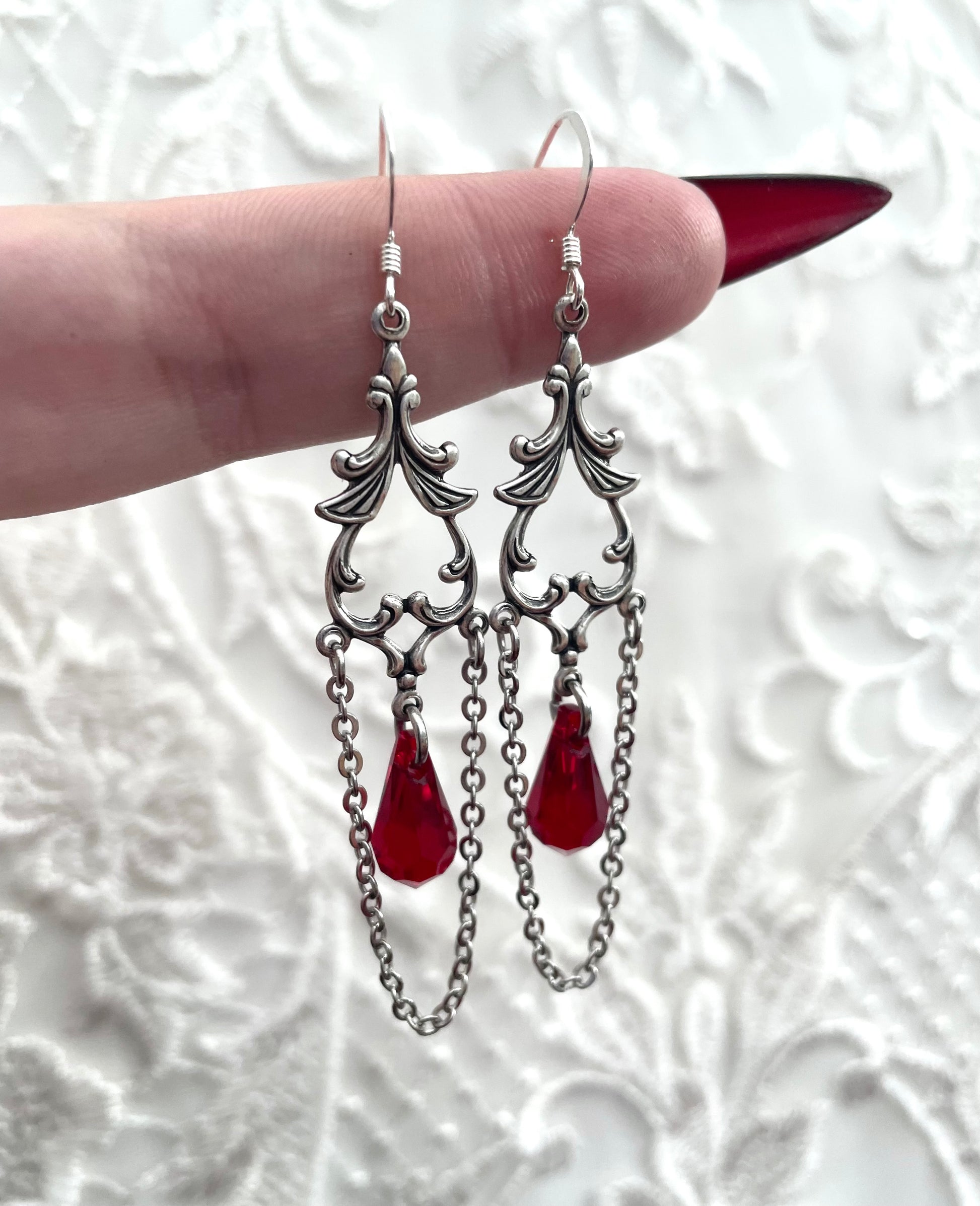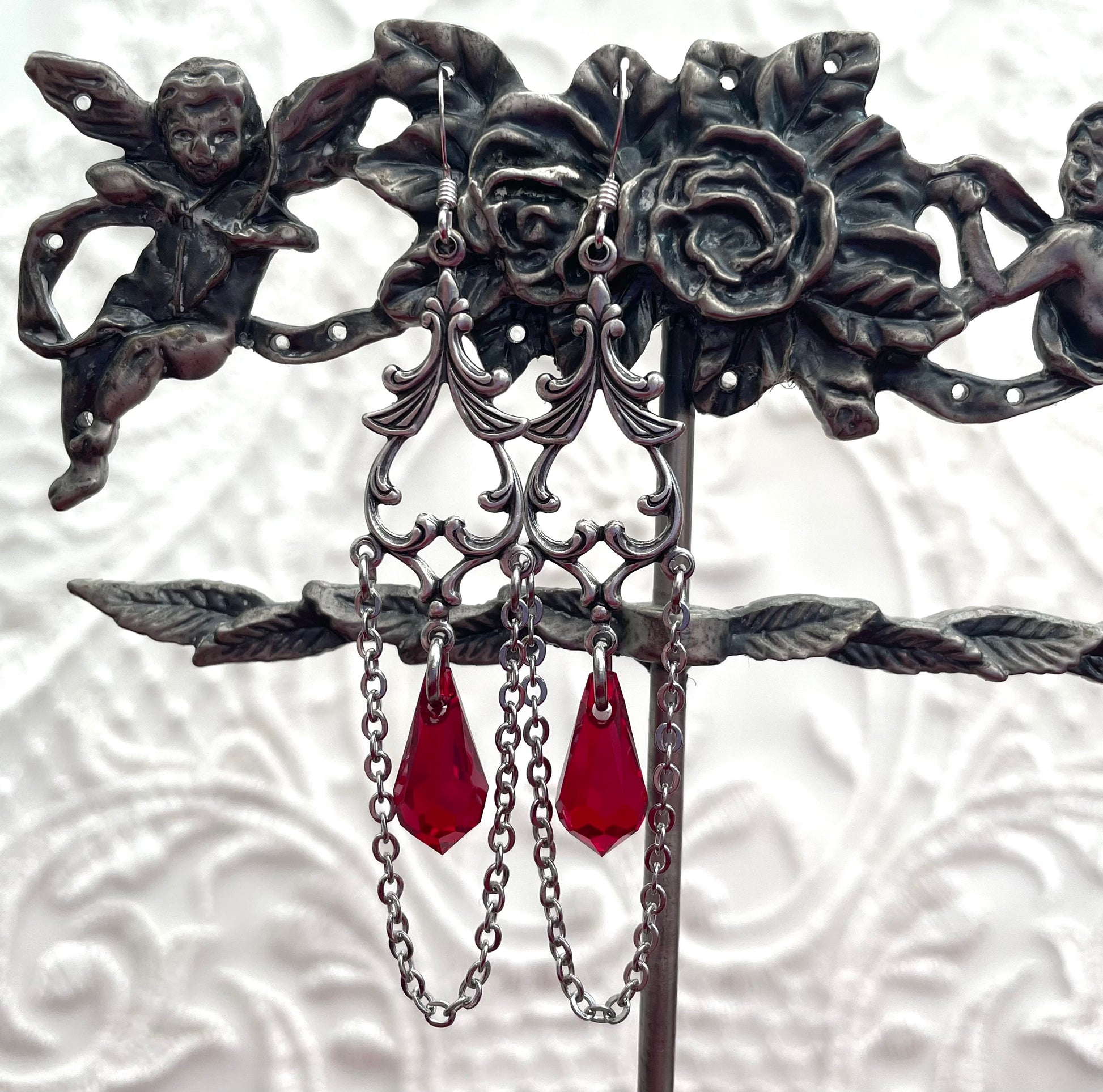These victorian inspired earrings feature beautifully faceted glass drops and a dainty chain to complete the overall shape.