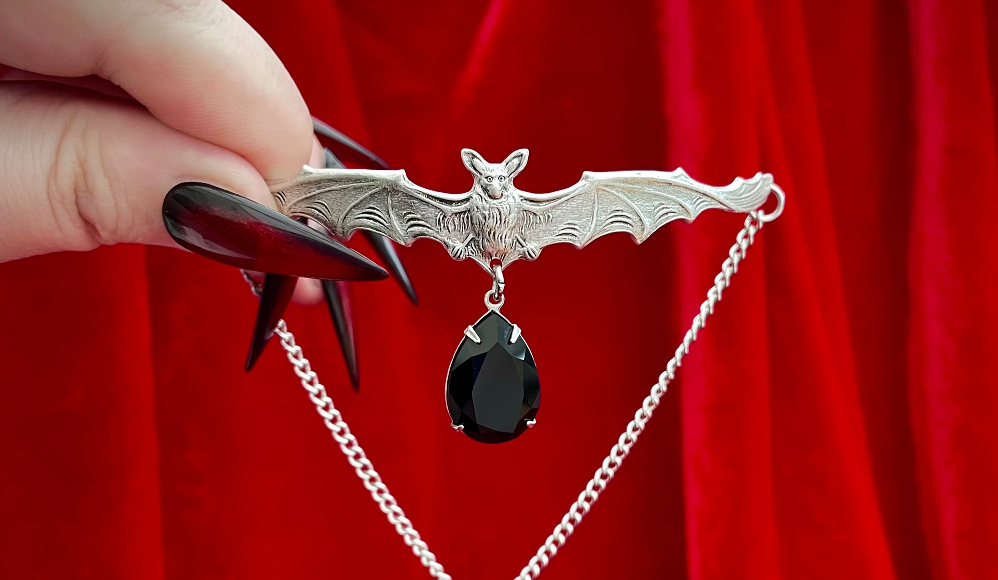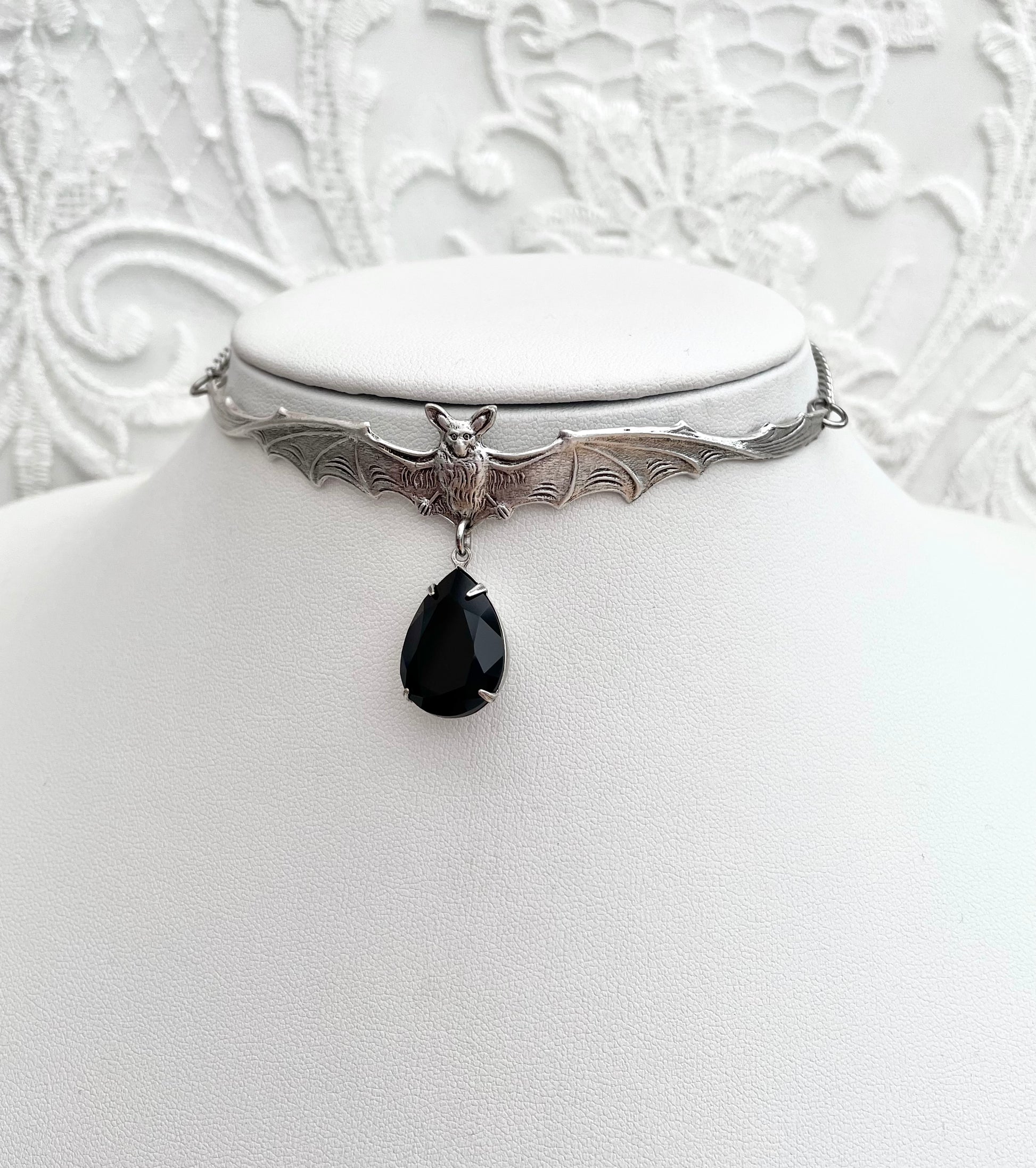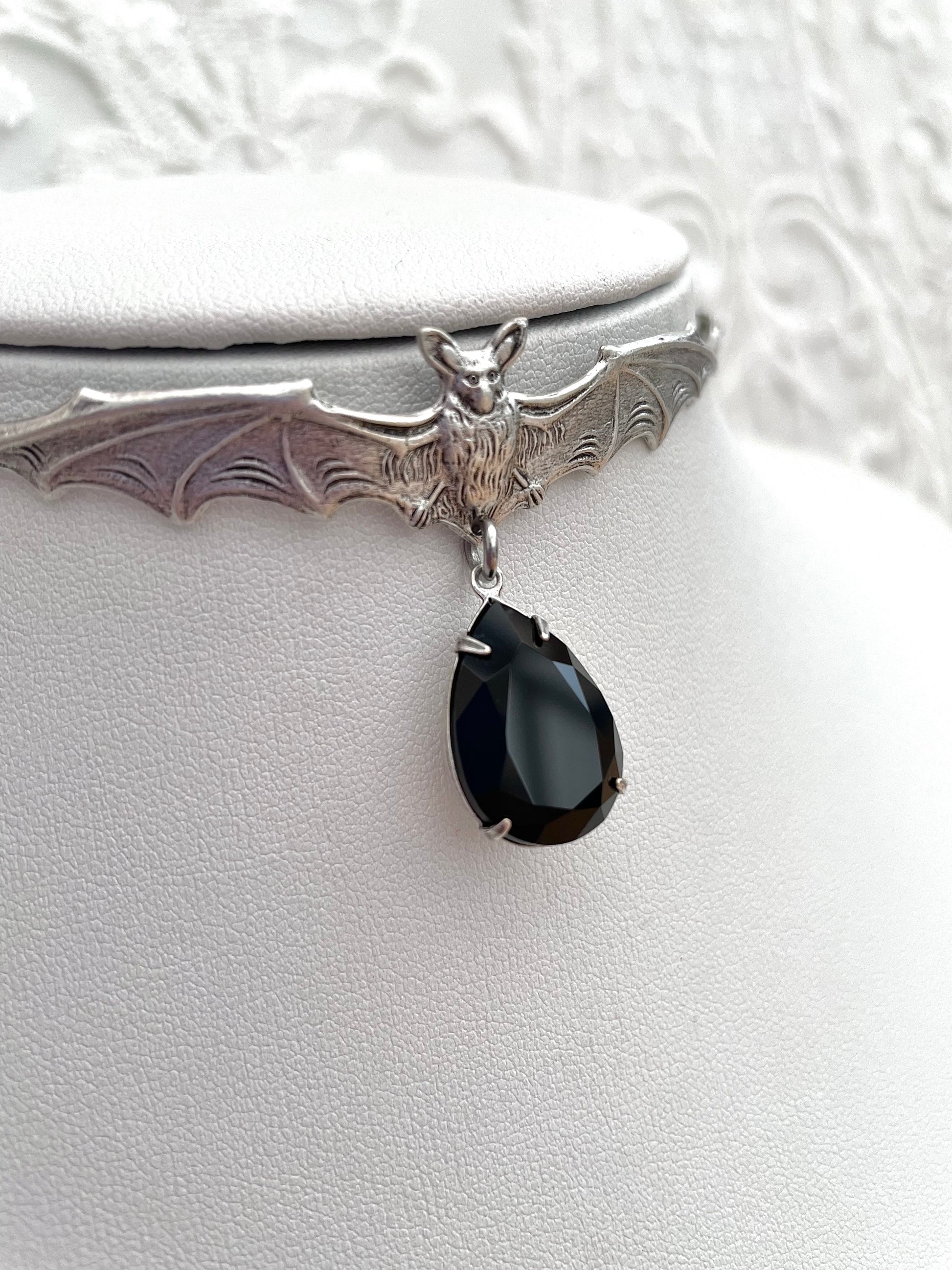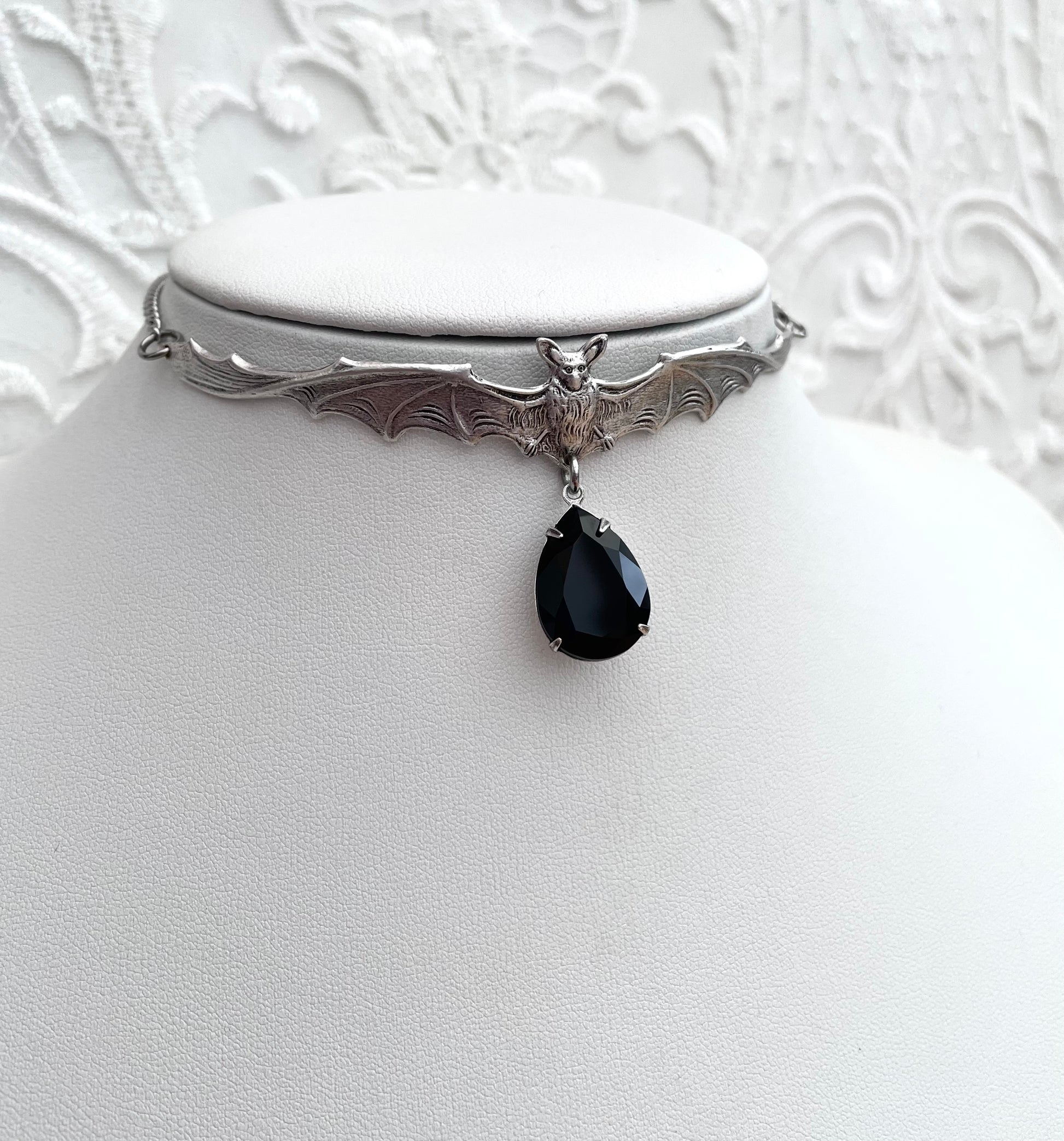 This dainty vampire inspired choker features a silver bat accompanied by a gorgeous, finely cut, high quality glass jewel. The bat itself has been arched with a tool so that it sits against the curve of the wearer's neck comfortably. Whilst the metal is strong, it is also malleable enough to gently handle into an arch that is appropriate for your neck shape.