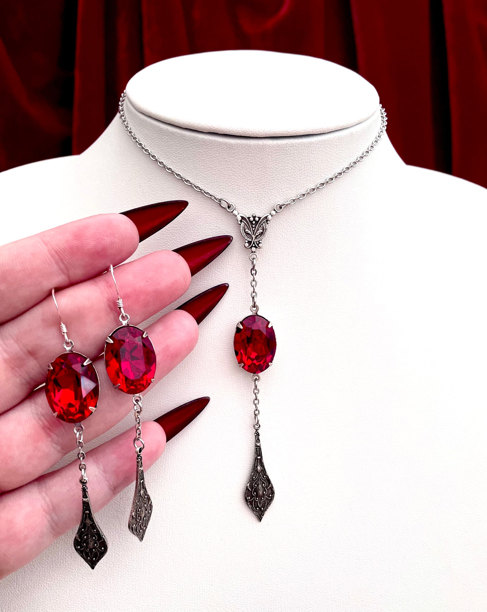 These statement earrings feature beautifully faceted glass jewels that sit in silver settings. Joining these gorgeous jewels are highly detailed silver drops. The overall size of the jewel itself is 18x13mm.