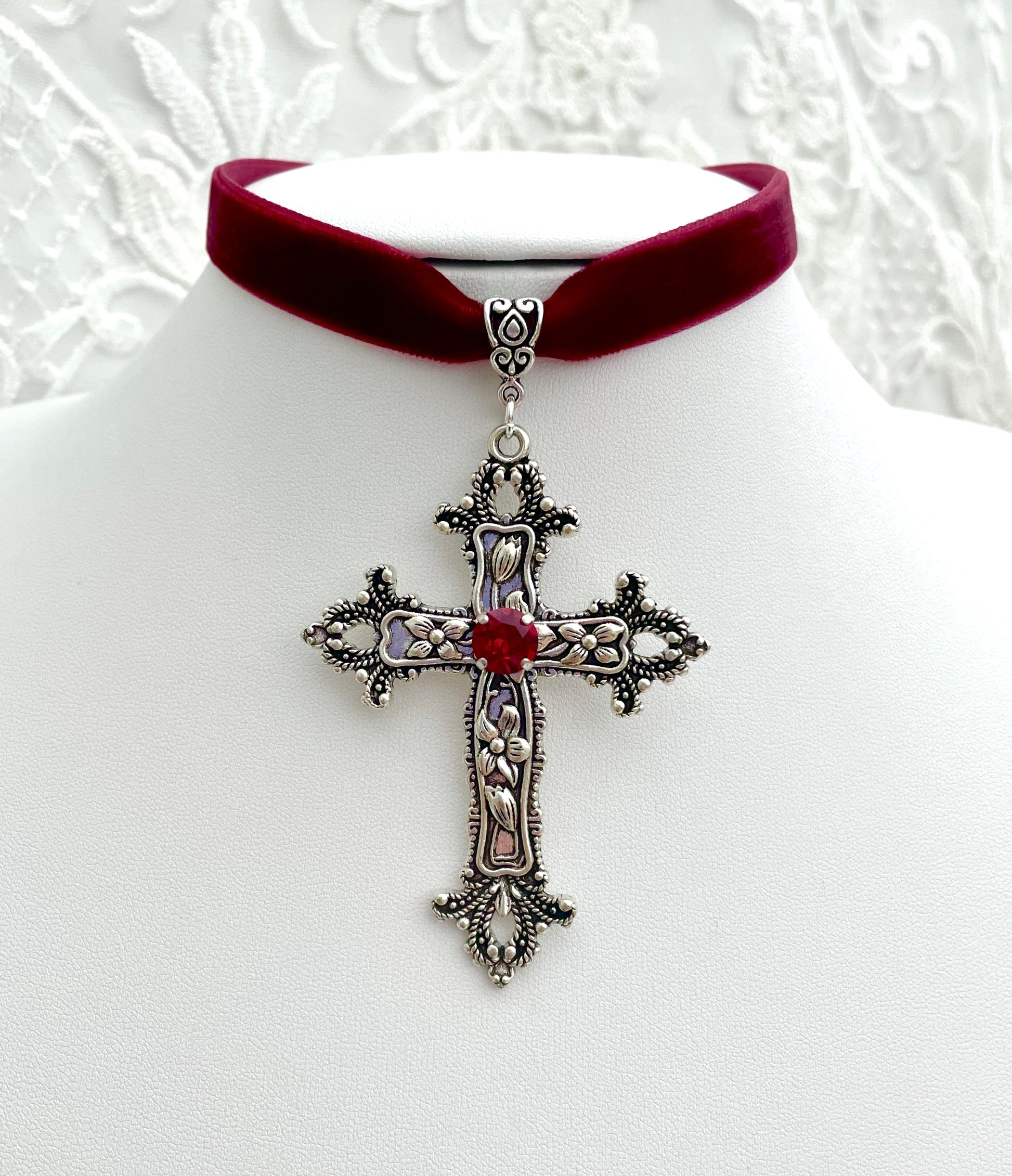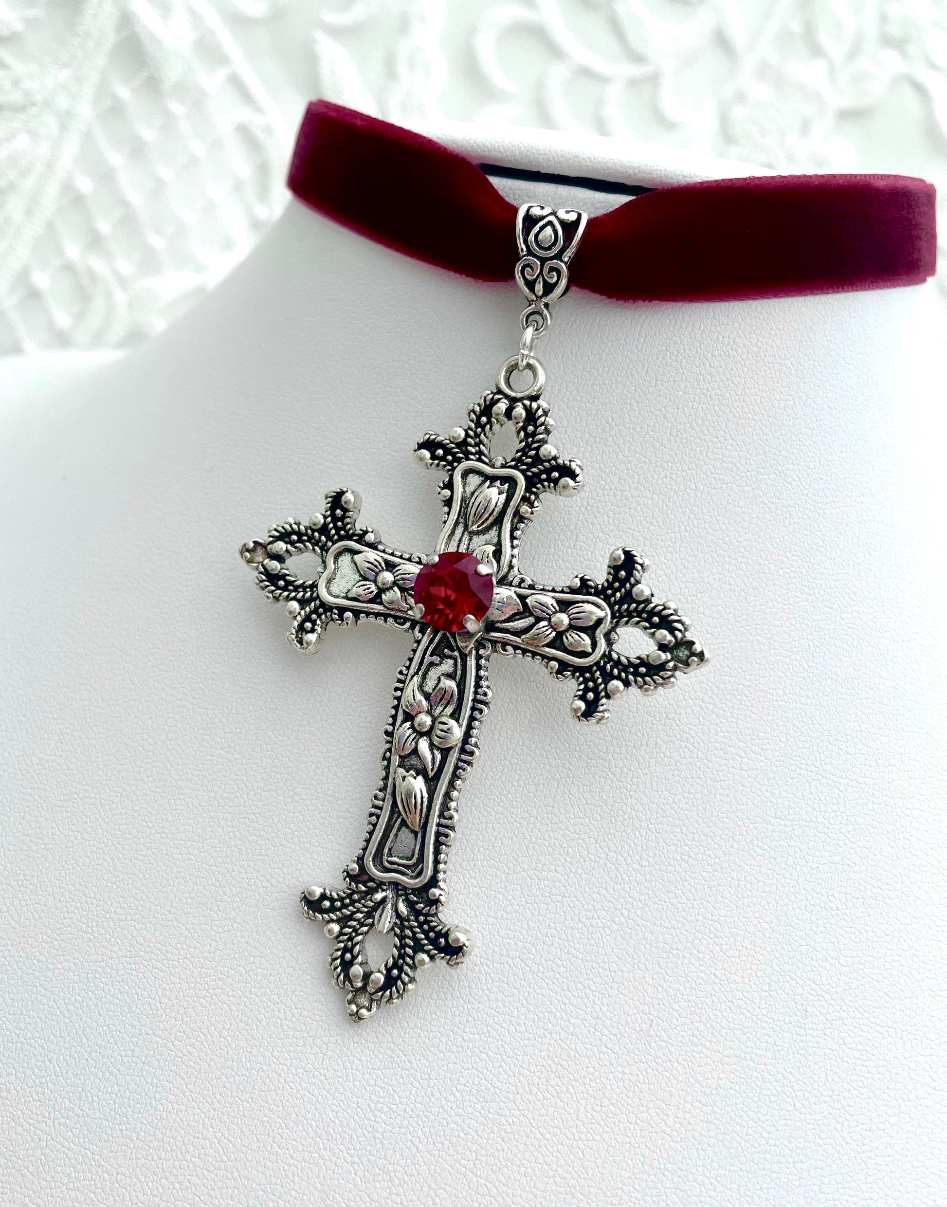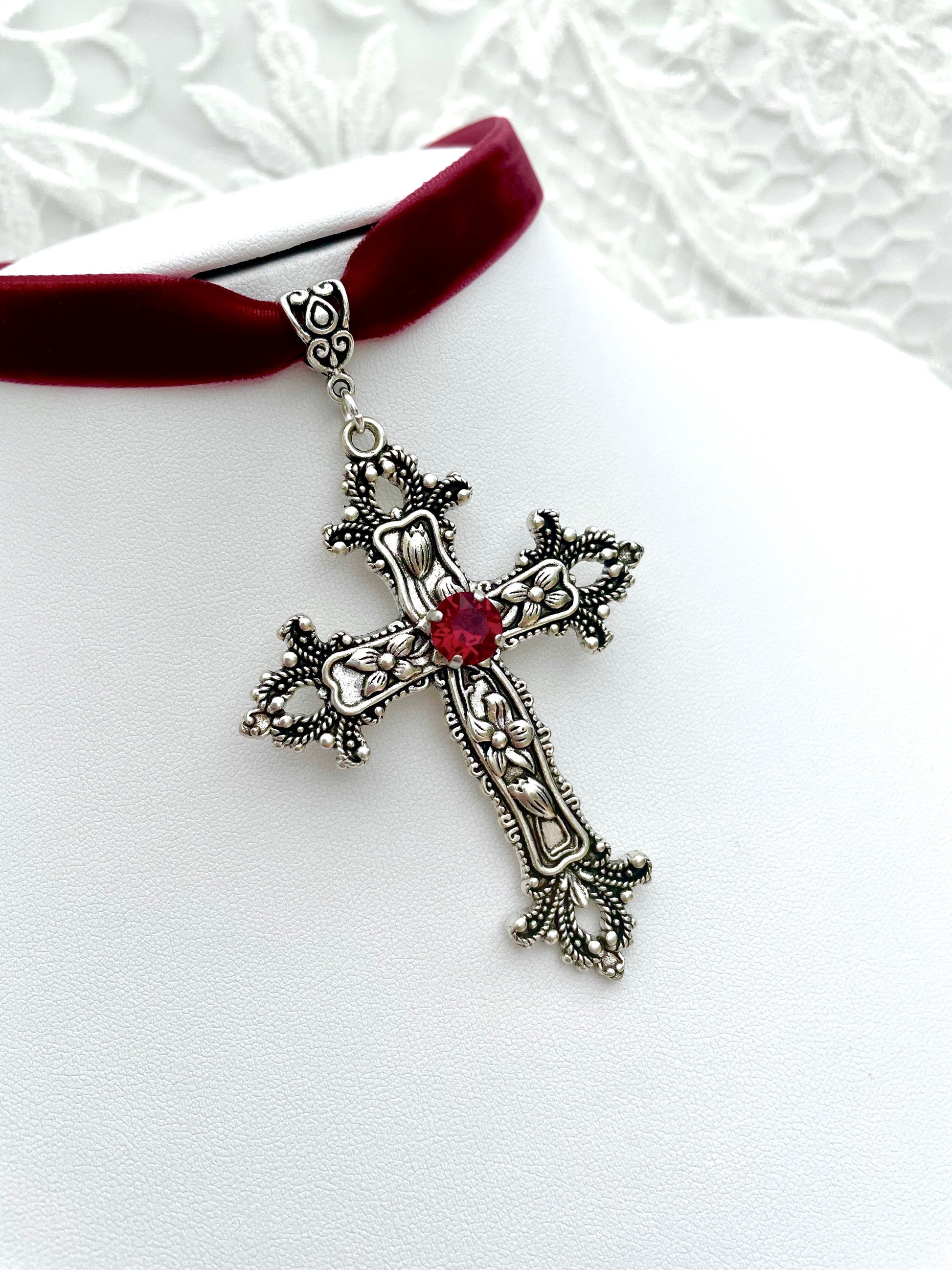 This statement choker features a gorgeously detailed floral cross that has been embellished with a high quality, beautifully cut glass jewel which reflects in the light beautifully. The cross connects to a detailed bail and hangs from a black velvet choker.