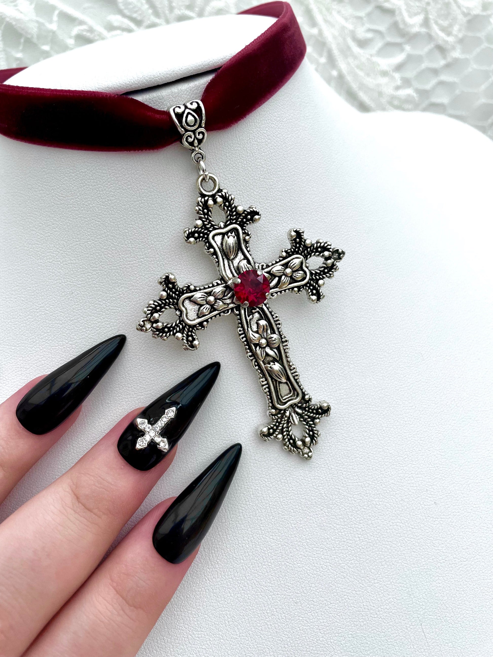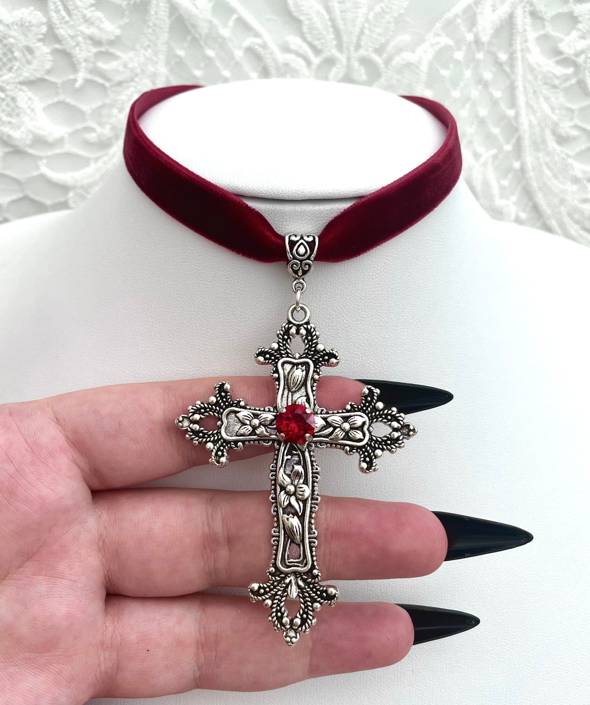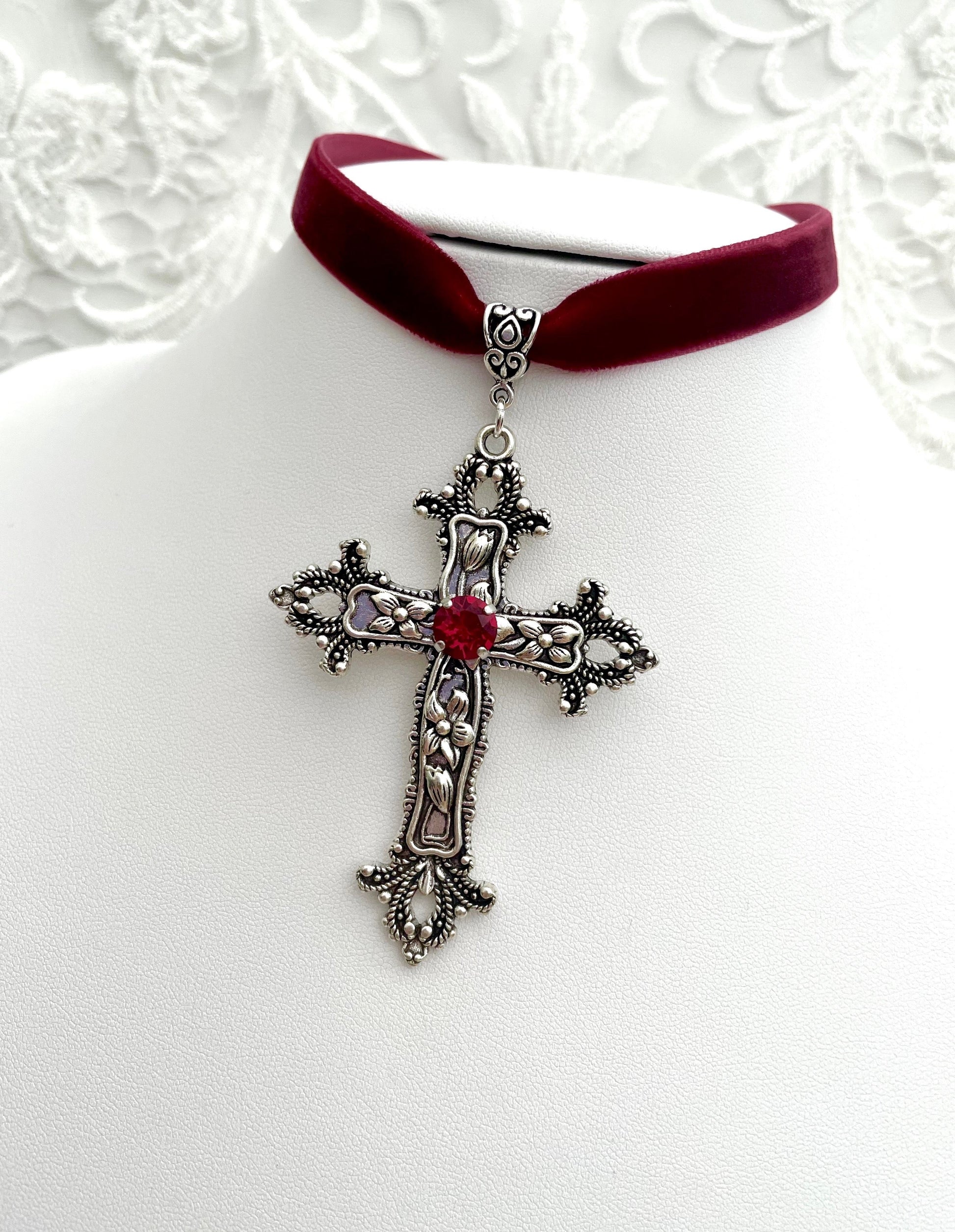 This statement choker features a gorgeously detailed floral cross that has been embellished with a high quality, beautifully cut glass jewel which reflects in the light beautifully. The cross connects to a detailed bail and hangs from a black velvet choker.