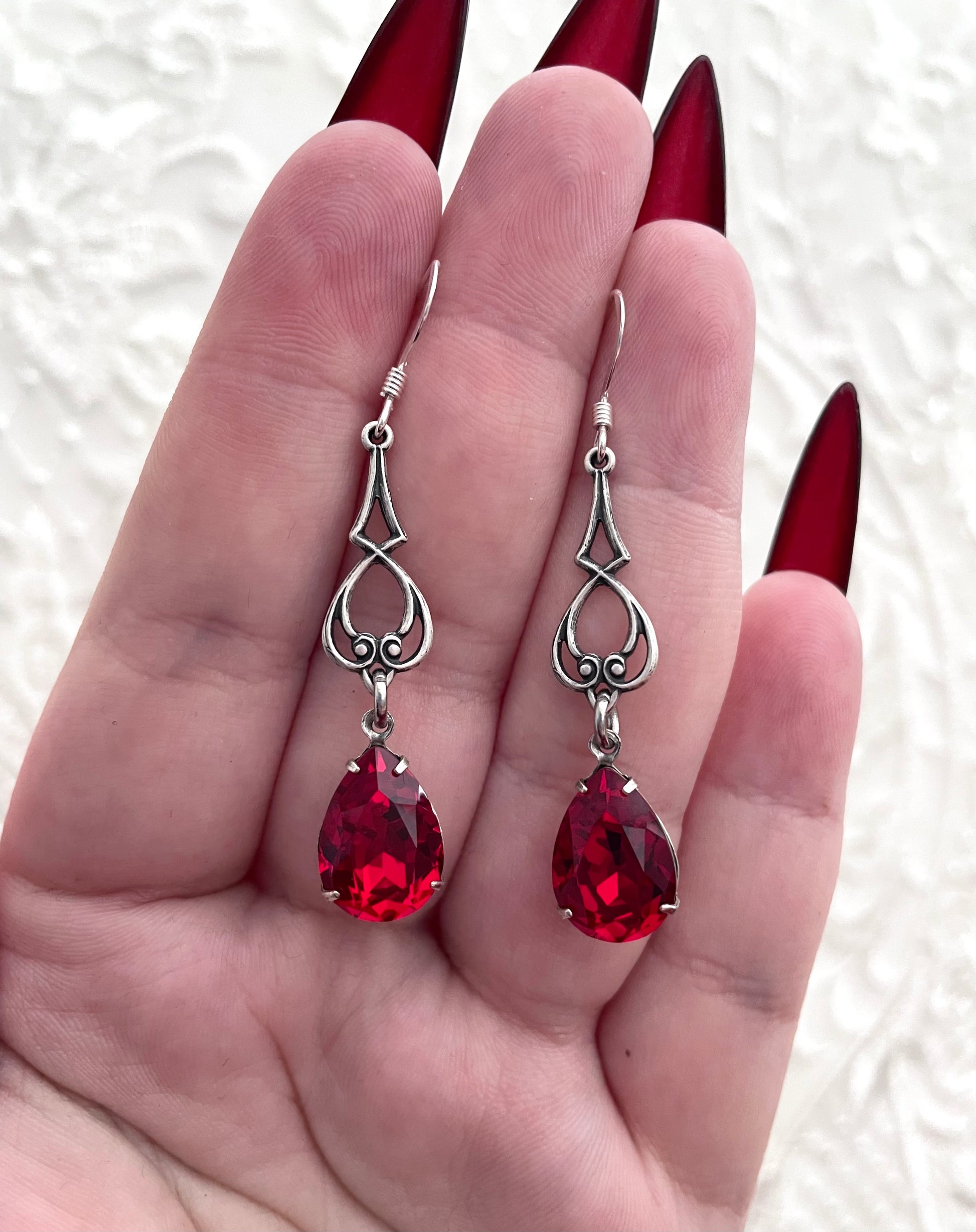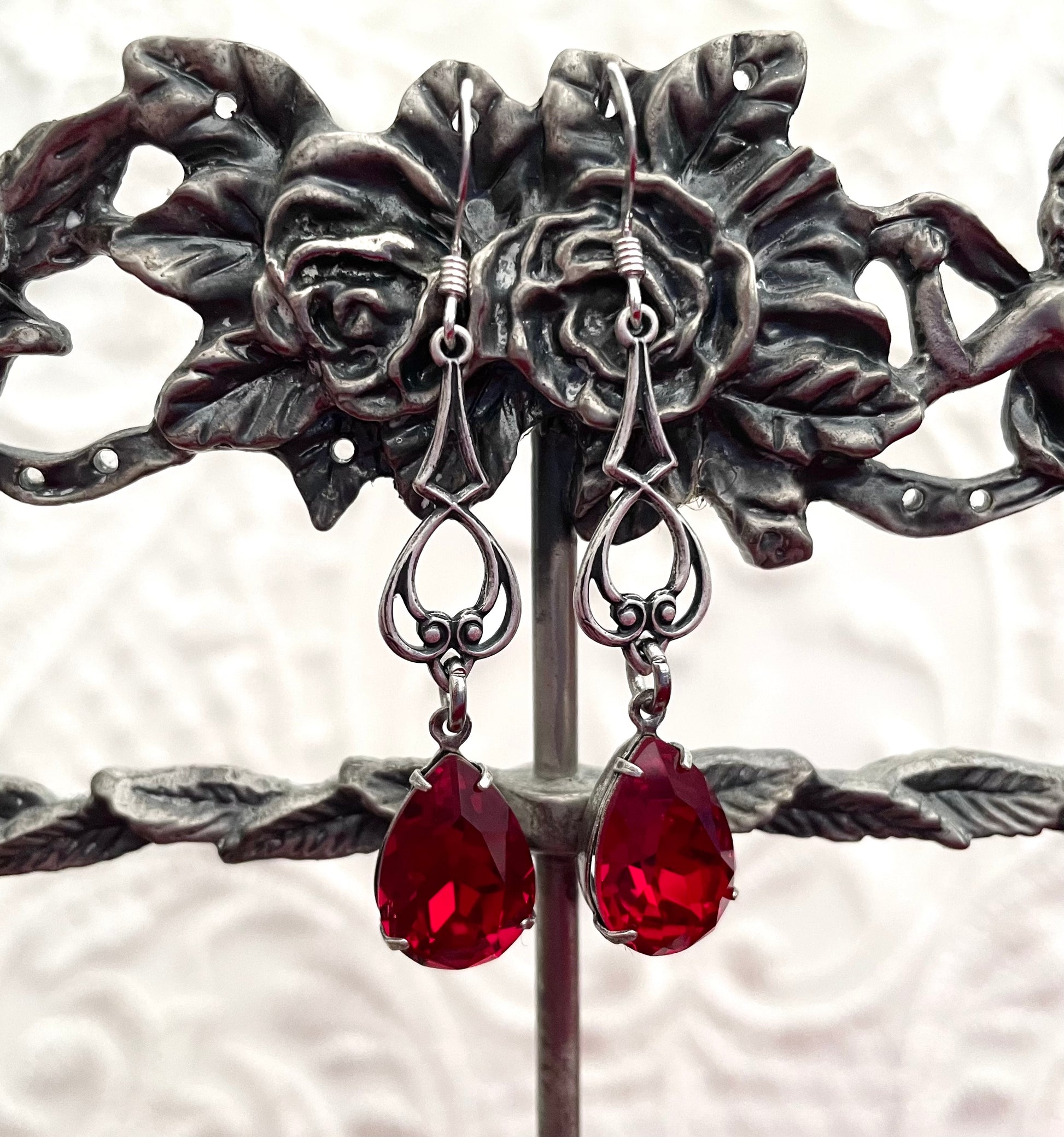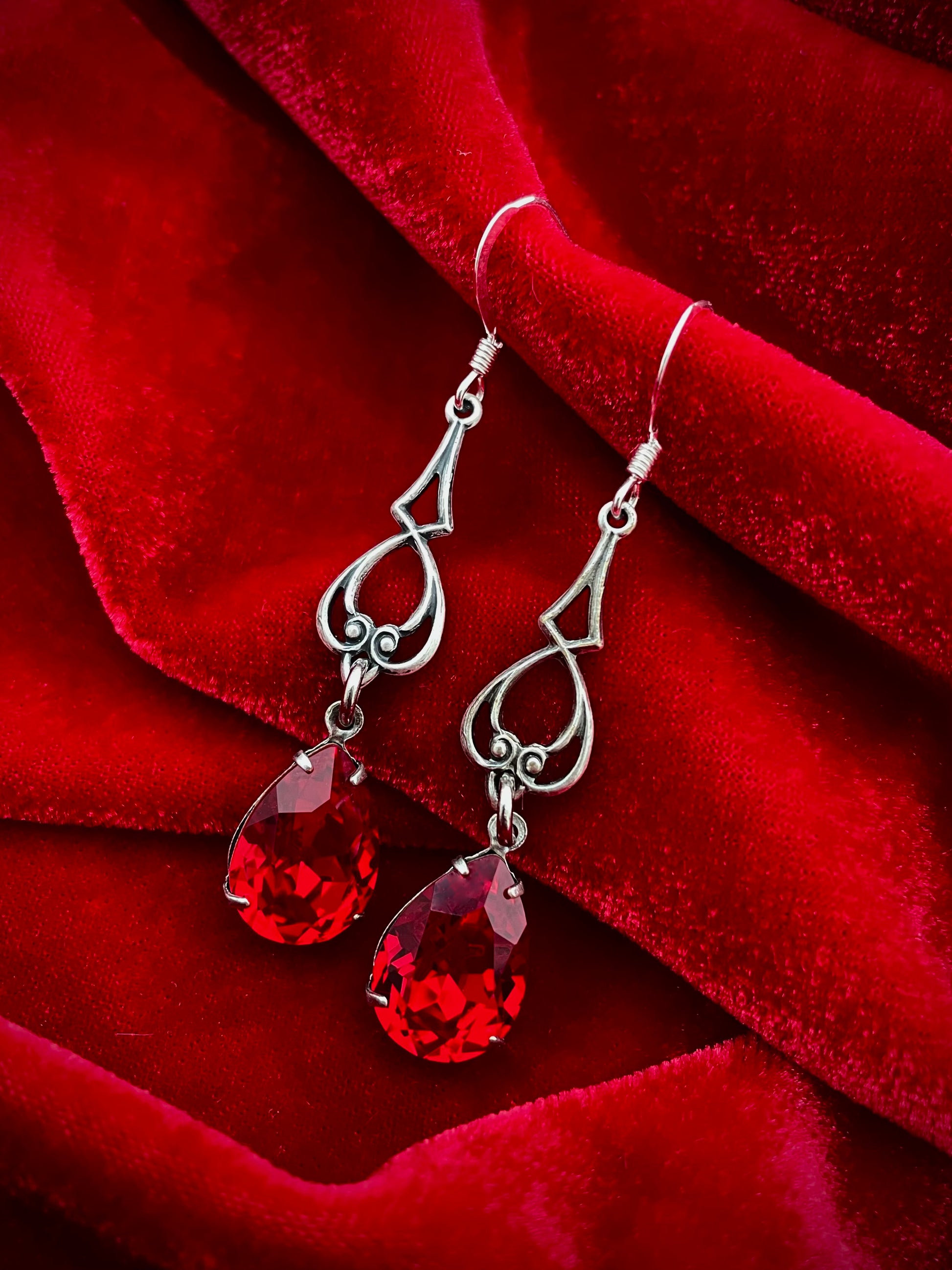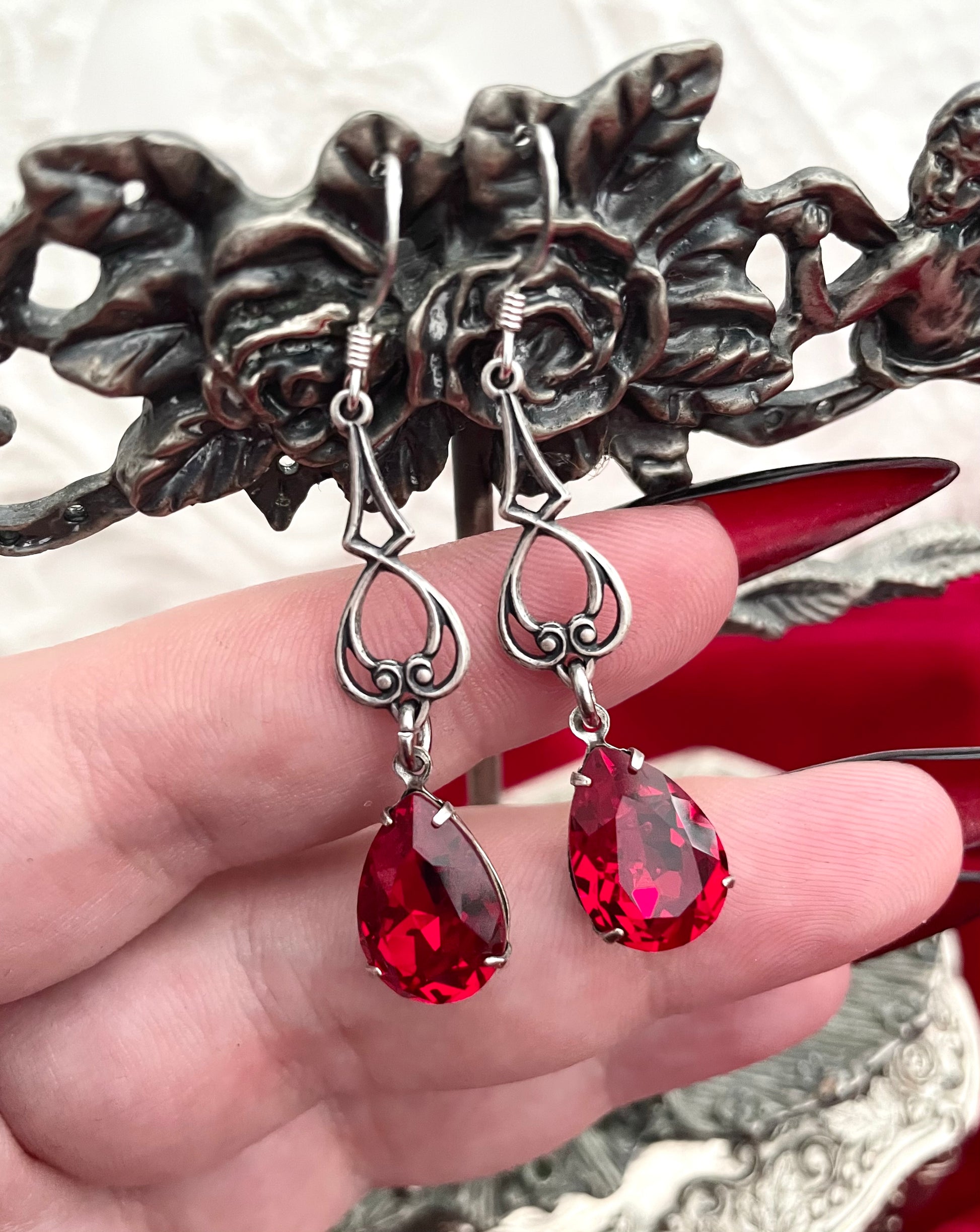 Materials include; oxidised sterling silver plated brass, sterling silver or steel (depending on the earrings selected) and high quality, high precision cut glass originating from Europe.